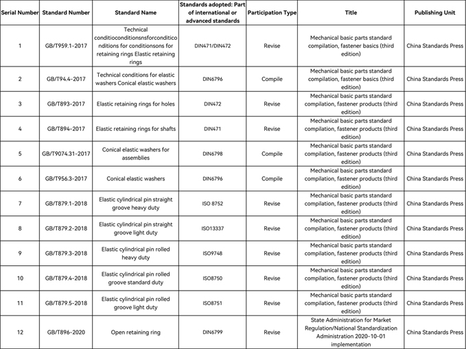 Compania Dongbo a ocupat funcția de membru al Comitetului Tehnic Național pentru Standardizarea Elemente de fixare timp de mai mulți ani și a găzduit a 4 -a reuniune anuală a celei de -a 5 -a tehnice naționale naționale Comitetul pentru standardizarea elementelor de fixare în 2015. A condus succesiv sau a participat la formularea și revizuirea a 13 standarde naționale, inclusiv tehnică Condiții pentru inele de reținere elastică, Pinii cilindrici elastici și șaibele cu discuri.